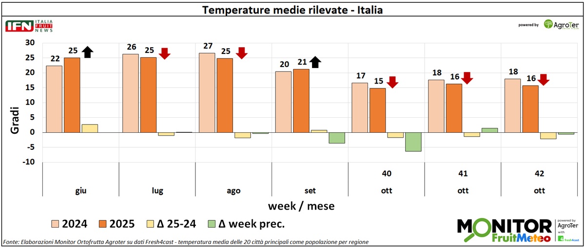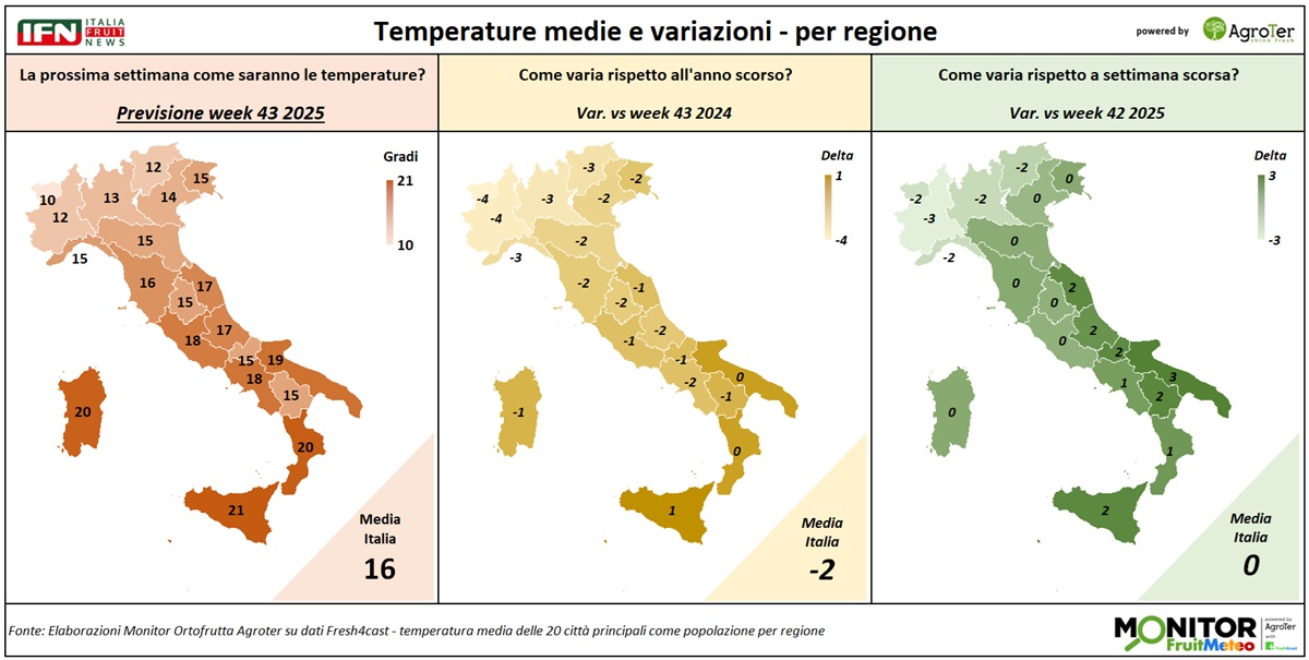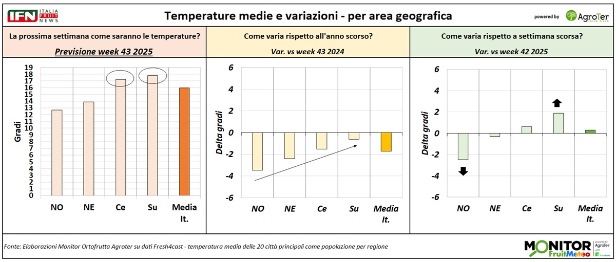 Le analisi del Monitor Ortofrutta si arricchiscono grazie a una nuova collaborazione dedicata a esplorare settimanalmente una variabile spesso decisiva per il settore ortofrutticolo: il meteo. Tra i diversi fattori che influenzano le condizioni climatiche, questa nuova rubrica si concentra in particolare sulle temperature medie registrate lungo la Penisola, con il supporto di Fresh4cast, una piattaforma software in cloud specializzata nella previsione della domanda e nell'ottimizzazione della supply chain per il settore ortofrutticolo.