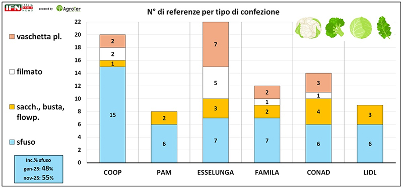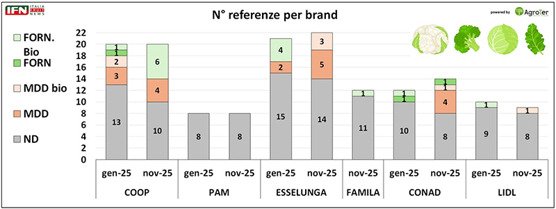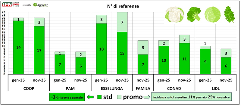 L’analisi odierna di IFN, condotta a fine novembre nella piazza di Parma su sei insegne, prende in esame un ampio insieme di referenze appartenenti alla famiglia delle brassicacee. La categoria, già oggetto di studio a gennaio, viene osservata nuovamente per valutarne l’evoluzione, in un contesto in cui la profondità assortimentale è cresciuta sensibilmente negli ultimi anni.