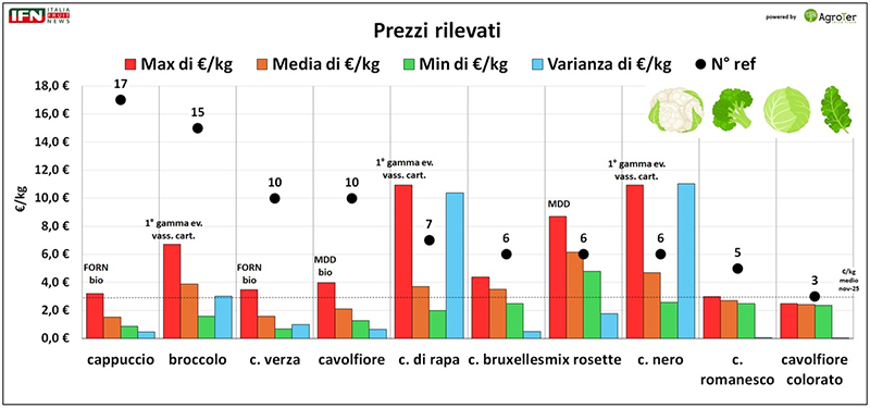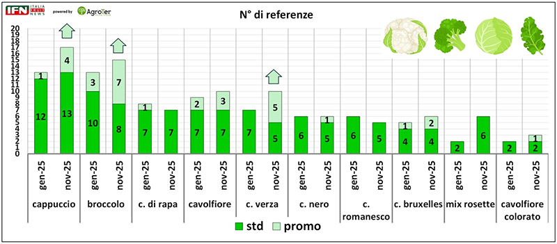 Brassicacee: da gennaio, raddoppiano le promozioni. Fino a 22 referenze, aumentano sia sfuso che brand. Picchi di prezzo fino agli 11 €/kg