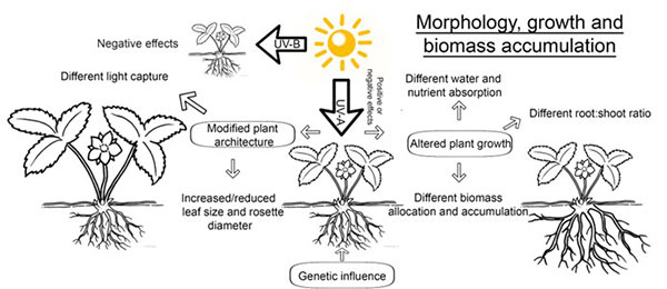 Numerosi studi hanno stabilito che nonostante i molti effetti negativi, la radiazione ultravioletta può influenzare positivamente molti processi fisiologici delle piante. La lunghezza d’onda, l’intensità e il periodo di esposizione possono condizionare la qualità e la produttività delle colture orticole: basse dosi di UV possono stimolare l’accumulo di biomassa (aumentando la produzione) e favorire la sintesi di numerosi composti nutraceutici, fondamentali per l’alimentazione umana. La sintesi di questi composti è stimolata dalla risposta della pianta allo stress causato dall’esposizione a specifiche tipologie di raggi UV. Inoltre, è dimostrato che la radiazione UV può influenzare l’architettura delle piante, parametro importante per la commercializzazione dei prodotti, soprattutto delle piante ornamentali. Lo stress indotto dall’esposizione alla luce UV incrementa anche la resistenza delle piante ad insetti e patogeni, mentre riduce la perdita di qualità dei prodotti in post-raccolta.