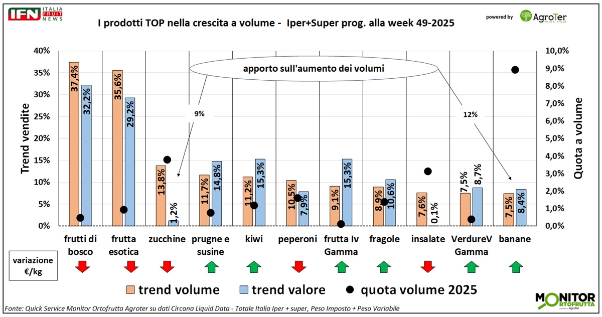 Che il 2025 si proiettasse come un anno favorevole per vendite e consumi del reparto ortofrutta della Gdo lo intuivamo già da mesi, sulla base delle performance monitorate e analizzate settimana dopo settimana. Un andamento positivo, pur con fisiologici momenti di alti e bassi. Il comparto che osserviamo è però complesso: le diverse categorie risentono sia delle variabili meteo sia del cambiamento delle abitudini di consumo degli italiani. Di conseguenza, il contributo alla crescita non è uniforme e varia sensibilmente tra i prodotti più e meno performanti. In questa analisi ci focalizziamo sui primi undici prodotti per crescita delle vendite a volume, includendo anche le banane, che rappresentano la prima categoria per contributo assoluto all’aumento dei volumi nei canali di ipermercati e supermercati.