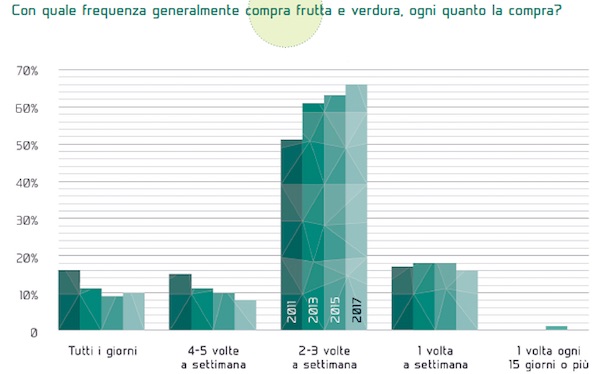 A fronte di un 54% degli intervistati che si dichiara forte consumatore di prodotti ortofrutticoli - e anche rispetto a un 90% di persone che afferma di assumere frutta e verdura tutti i giorni - l’indagine del Monitor Ortofrutta ha rilevato un calo delle frequenze d’acquisto. Infatti, coloro che rispondono di acquistare frutta e verdura “tutti i giorni” o “quattro-cinque volte la settimana” passano dal 31% del 2011 al 17% del 2017.
