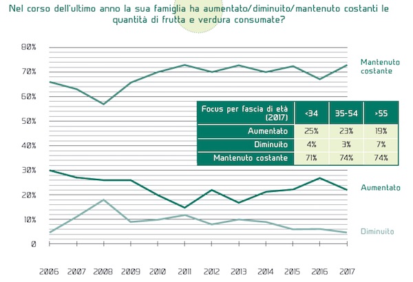 Dal 2008 al 2017 diminuiscono coloro che pensano di avere aumentato i volumi e anche quelli che ritengono di averli diminuiti. Entrambi in favore di chi crede di avere mantenuto costanti i quantitativi. Negli anni, dunque, il 70% degli italiani si è adagiato sulle proprie abitudini, ritenendo di avere un consumo equilibrato. Unico aspetto positivo: sono proprio i più giovani (quelli che consumano meno ortofrutta) a dichiarare di avere aumentato i consumi, forse tradendo così una loro intenzione a incrementare i quantitativi.