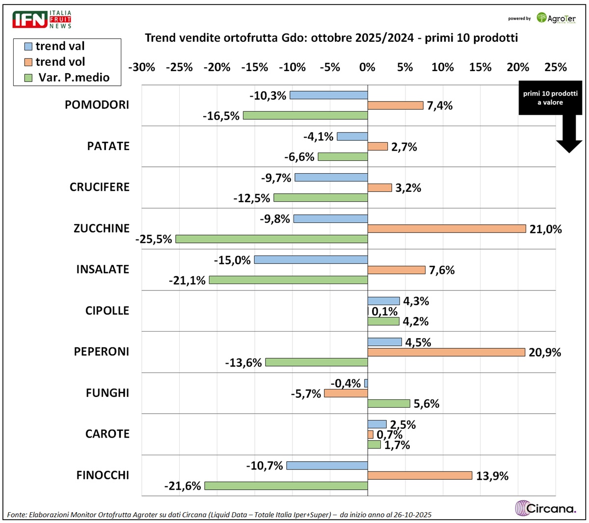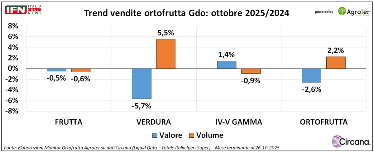 L’analisi del Monitor Ortofrutta di Agroter, in collaborazione con Circana, ci mostra come a ottobre i consumi del reparto ortofrutta siano cresciuti, mentre il fatturato ha registrato un calo. La flessione è dovuta soprattutto al forte ribasso del prezzo medio mix della verdura, non compensato dall’aumento dei volumi, mentre frutta e IV-V Gamma si mantengono più stabili.