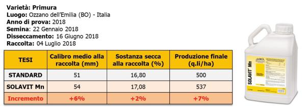 Quali sono stati i risultati? "Solavit® Mn - illustria Biolchim - ha determinato un significativo anticipo nella maturazione dei tuberi (circa 7 giorni), nonché un incremento del calibro medio (+6%) e della sostanza secca (+2%) alla raccolta, conclusasi con un aumento produttivo del 7%. Il modello previsionale Agromet ha registrato ed anticipato l’efficacia di Solavit® Mn, confermandone gli effetti positivi sulla crescita della pianta, sulla qualità e sul calibro del raccolto".