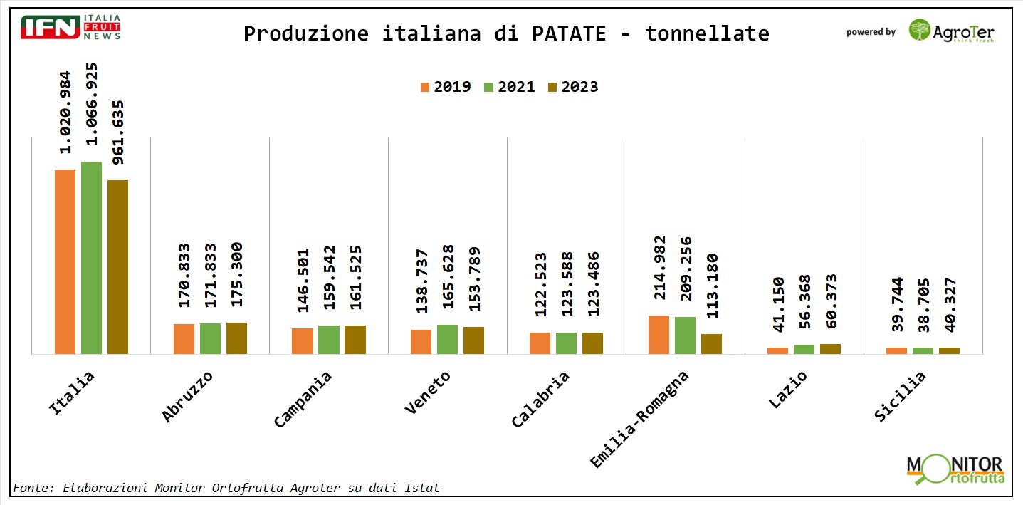 Negli ultimi 5 anni la produzione di patate (comprese le novelle ed escludendo quelle dolci) si è assestata in Italia su poco più di 1 milione di tonnellate all’anno, a parte il 2023, dove i raccolti sono scesi sotto questa soglia, fermandosi a 960 mila tonnellate. Analizzando i dati delle principali regioni pataticole, è lampante come il principale colpevole sia l’Emilia-Romagna, che, nel quinquiennio considerato, ha perso ben 100 mila tonnellate e oltre 1.000 ettari (sui 5 mila di partenza). Senza dubbio l’alluvione ci ha messo del suo, perché ha ritardato le semine, ma è altrettanto vero che lo spauracchio degli elateridi - detti volgarmente ferretti - è ben impresso fra i produttori, che limitano il più possibile le superfici dedicate a questa coltura. Vedremo se il 2024 proseguirà su questa linea.