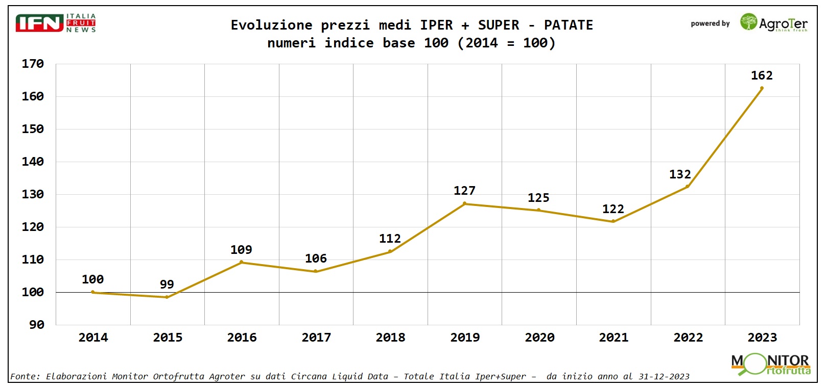 In sostanza, come si evince dal grafico dei prezzi medi, le quotazioni sono gradualmente cresciute; a partire dal 2016 nell’ordine di circa 10 punti percentuali, per poi schizzare a 25 punti con il Covid e senza più tornare indietro. Anzi, nell’ultimo anno c’è stato un vero e proprio exploit, con i prezzi che sono aumentati del 60% rispetto a 10 anni fa. È chiaro ed evidente che l’effetto “campagna” ha influenzato i valori in campo, soprattutto l’anno scorso, ma è altrettanto vero che i volumi non calano nonostante l’aumento dei prezzi. Quindi, il consumatore è disposto ad accettare anche incrementi significativi per un prodotto di base come le patate. La domanda però è solo effetto rigidità o l’offerta ha innalzato l’asticella della proposta? Oppure entrambe le cose? (am)