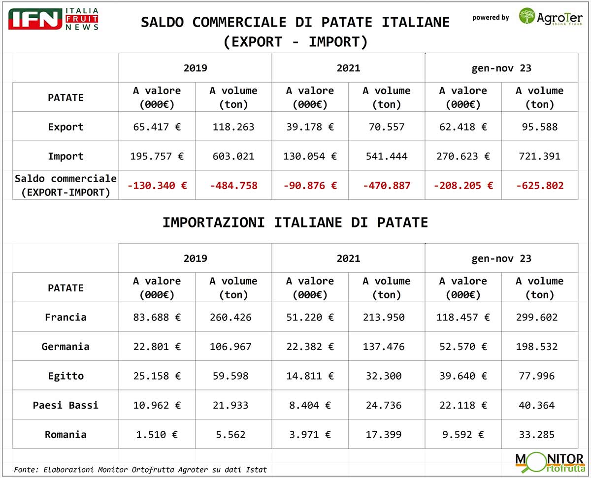 Come spesso accade, a un calo dell’offerta nazionale corrisponde un aumento delle importazioni dall’estero per bilanciare la carenza di volumi, ed è esattamente ciò che è successo l’anno scorso per le patate. Nonostante non sia ancora disponibile il dato del mese di dicembre, il 2023 è già l’anno record sul fronte delle importazioni, che hanno superato la soglia di 700 mila tonnellate e si avvicinano a 300 milioni di euro.
