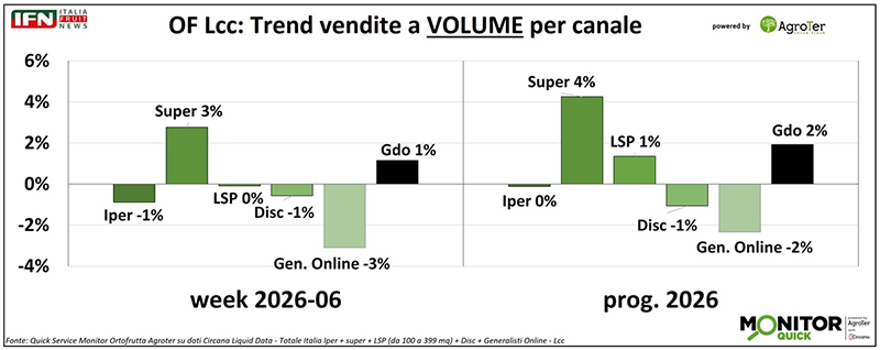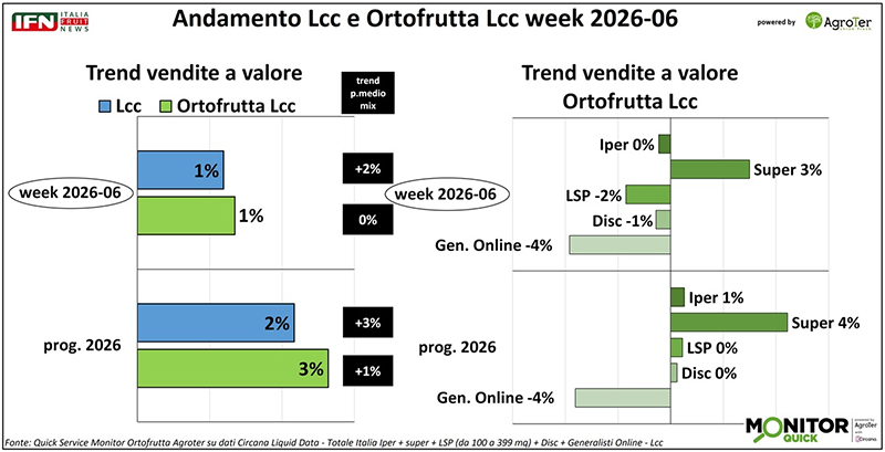 Nella settimana 6 si registra una timida ripresa delle vendite di ortofrutta Lcc nella Gdo, dopo il netto calo osservato nella settimana precedente. Tra i diversi canali, il supermercato si distingue per le migliori performance, mentre gli altri continuano a mostrare difficoltà.