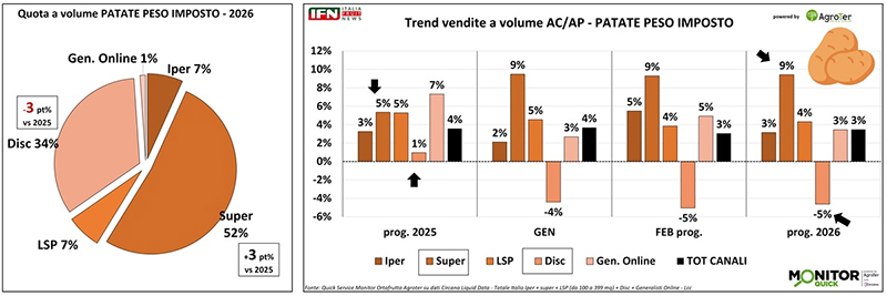 Tra le categorie del reparto spiccano le patate, che evidenziano consumi in costante crescita sia nel 2025 sia nel 2026, sostenuti anche da una diminuzione del prezzo medio mix. Nel canale discount, tuttavia, i volumi risultano negativi nelle prime sei settimane dell’anno, determinando una perdita di quota rispetto al 2025.