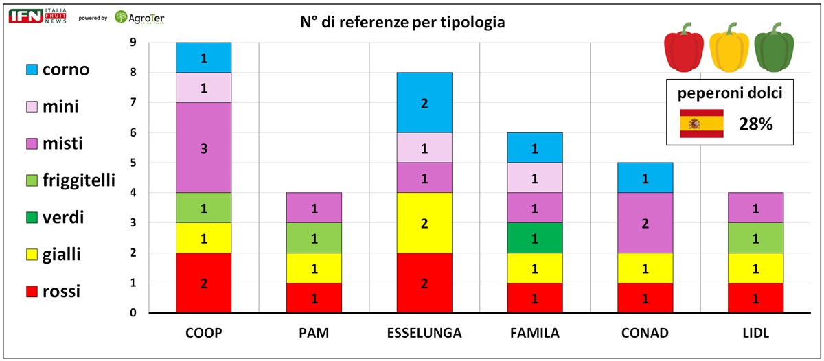 Nell’assortimento di peperoni prevale – come di consueto - la tipologia dolce, mentre quella piccante (che contiene capsaicina) è presente solo in quantità limitate, anche se nel Famila raggiunge le 3 referenze. Coop ed Esselunga offrono le gamme più ampie di peperoni dolci, con rispettivamente 9 e 8 referenze, mentre gli altri punti vendita propongono da 4 a 6 varianti.