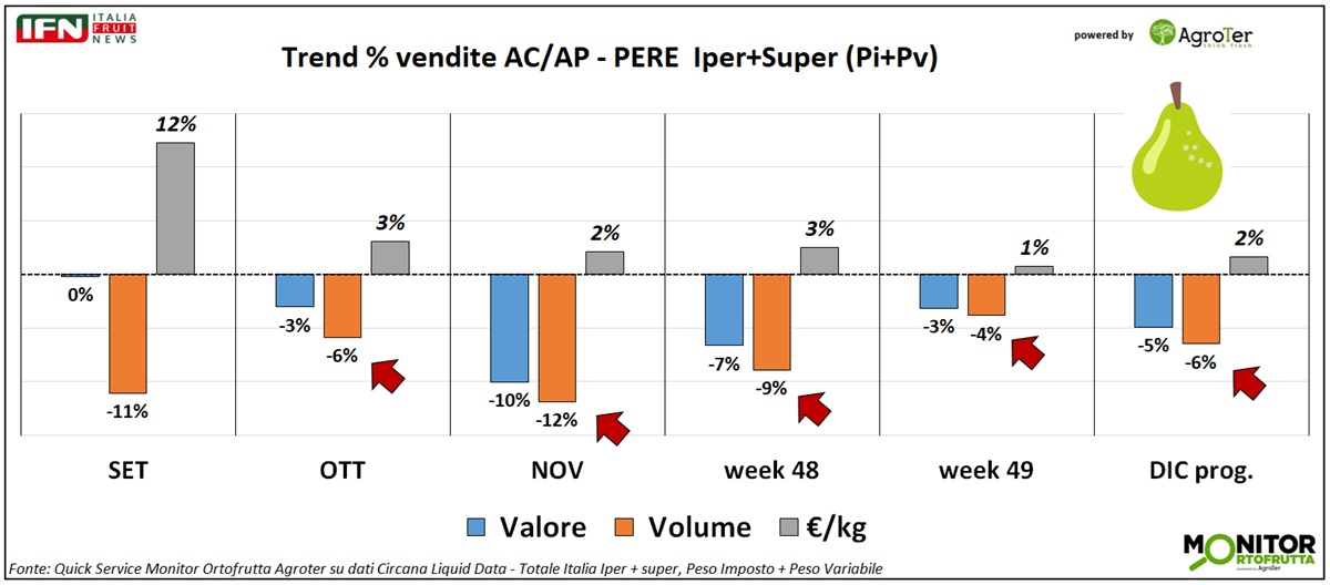 Le pere rientrano tra le categorie dell’ortofrutta che stanno incontrando maggiori difficoltà, sia negli ultimi anni sia nella fase iniziale e centrale dell’attuale campagna. Da settembre in poi, le vendite in ipermercati e supermercati risultano costantemente negative, con un picco critico a novembre, quando i volumi registrano un calo del 12%. A dicembre si osserva una lieve ripresa nel progressivo (-6%), a fronte però di un aumento contenuto del prezzo medio mix e nell’ordine di 2-3 punti tra ottobre, novembre e dicembre.