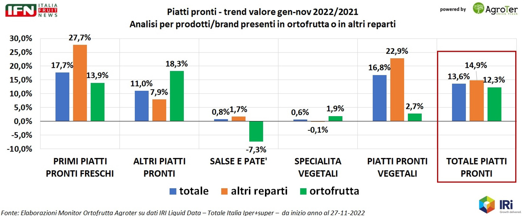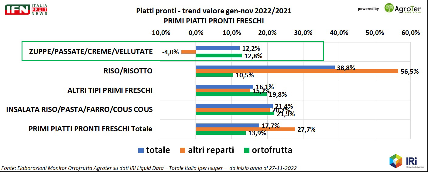 All’interno dei “primi piatti pronti freschi”, la prima categoria venduta in ortofrutta è quella delle “zuppe”, che comprende anche passate, creme e vellutate. Tuttavia, il trend è molto diverso per i prodotti venduti in ortofrutta (+12,8%) rispetto agli altri reparti (-4%), a dimostrazione della solidità di questo segmento in questo reparto. In seconda battuta troviamo il “riso e i risotti” e qui le performance migliori le vediamo negli altri reparti (+56,5%) anche se in ortofrutta performano comunque bene (+10,5%). Nelle altre famiglie di prodotto i trend sono sempre molto positivi e con poche differenze tra ortofrutta e gli altri reparti.