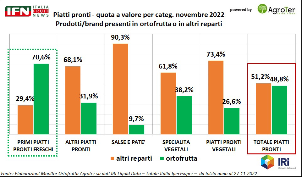 Come già anticipato, e come tutti i retailer ormai sanno, buona parte dei brand per i piatti pronti hanno trovato il loro massimo sviluppo nel reparto ortofrutta. Ad oggi, nel complesso, quasi la metà di questi prodotti (48,8%) sono venduti prettamente nel reparto frutta e verdura, ma se guardiamo il segmento che prima di tutti ha iniziato a inserire referenze nello scaffale refrigerato dell’ortofrutta, ovvero quello dei “primi piatti pronti freschi”, la quota venduta in questo reparto è preponderante (70,6%). All’interno di questa famiglia di prodotti, infatti, troviamo le zuppe, che sappiamo essere ormai una prestazione praticamente immancabile per il cliente che fa la spesa nel reparto frutta e verdura della Gdo.