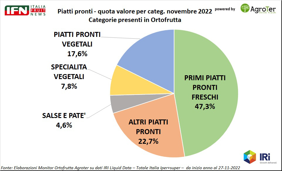 Ad oggi, fatto cento le vendite a valore dei piatti pronti, quasi la metà (il 47,3%) è sviluppata dai “primi piatti pronti freschi”. Poi una buona fetta di vendite (22,7%) è fatta dagli “altri piatti pronti” di cui fan parte i contorni, come il purè, o le varie versioni di polenta. I “piatti pronti vegetali”, come detto, sono composti da burger, crocchette e polpette, e pesano per il 17,6% delle vendite. Infine, le “specialità vegetali” (7,8% con olive e lupini ad esempio) e “salse e paté” con una quota di vendite ancora minima (4,6%).