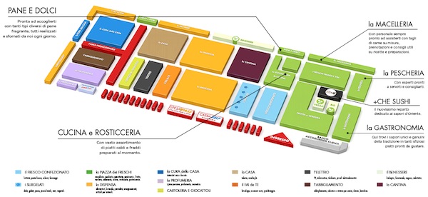 La mappa dell'ipermercato: la "piazza" dei freschi è a destra, davanti all'entrata