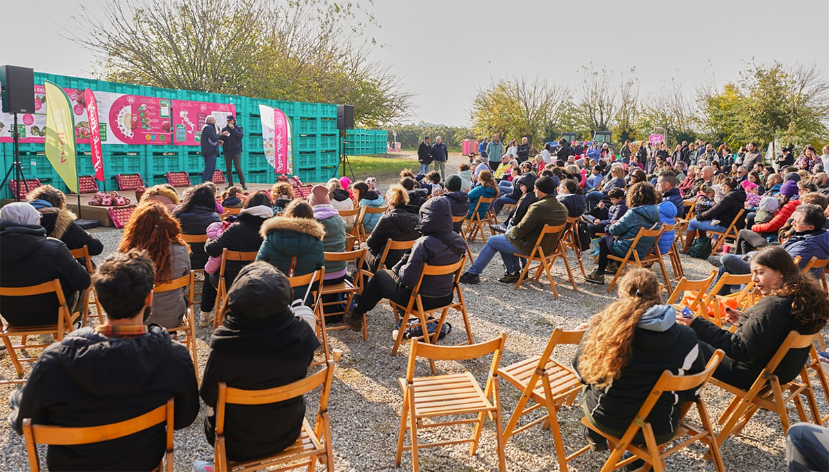 Aabato mattina, nel cuore della campagna ravennate, tra i filari ordinati di un meleto Pink Lady®, Faenza si è trasformata in una grande festa che ha visto protagoniste circa 150 famiglie, arrivate da ogni parte d’Italia per vivere un’esperienza rara: raccogliere in campo le mele “adottate” durante l’anno. Bambini, genitori e produttori fianco a fianco hanno animato il frutteto gestito da Loris e Manuel Berdondini dell’OP Granfrutta Zani, trasformandolo per un giorno in un laboratorio a cielo aperto.