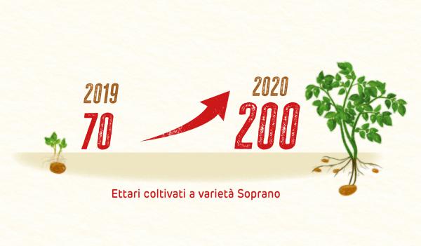 Tra queste c'è la varietà Soprano, commercializzata in esclusiva in molti comprensori in particolare della Sicilia e della Puglia. Soprano è una patata dalle ottime caratteristiche gustative e dalla tipica forma allungata, che risponde in maniera eccellente anche alle necessità degli agricoltori adattandosi sia a semine precoci che tardive. E, come si può notare dall'infografica sottostante, lo sviluppo di Soprano è stato notevole.