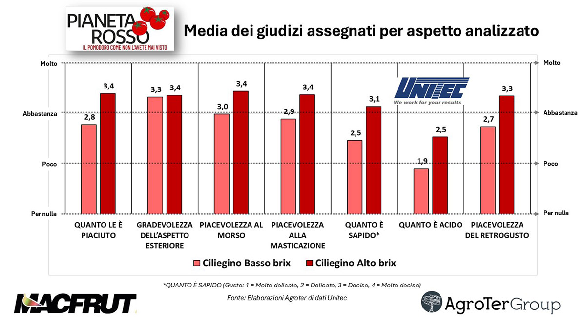 Grazie alla collaborazione con UNITEC, due tipologie di pomodoro ciliegino sono state messe a confronto: una prima, ottenuta dalle tecnologie Unitec, con grado Brix elevato (fra 10 e 11 gradi), quindi più intensa e sapida, e una con Brix più basso (fra 5 e 6 gradi), quindi, dal profilo gustativo più delicato e neutro. Le bacche sono state sottoposte a un panel test strutturato composto da 250 casi, in cui gli assaggiatori hanno valutato parametri come aspetto, consistenza, sapidità, acidità, retrogusto e gradimento complessivo, su una scala da 1 (“per nulla”) a 4 (“molto”).