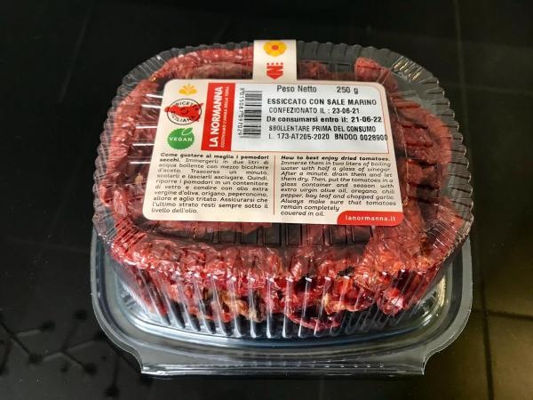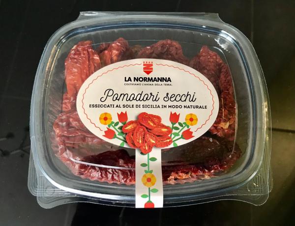 Il resto del lavoro, poi, lo fa il sole di Sicilia. Il processo di essiccamento può durare dai tre ai cinque giorni, dipende dalle giornate e dall'intensità dell'esposizione solare. Dopo questo passaggio - che viene fatto da luglio sino ai primi giorni di agosto - il pomodoro è pronto per essere confezionato in vaschette da 150 o da 250 grammi. La Normanna ha sviluppato un'etichetta in cui evidenzia la naturalezza del prodotto e ne mette in risalto la sicilianità, oltre a presentare sul retro consigli utili per la preparazione e il consumo.