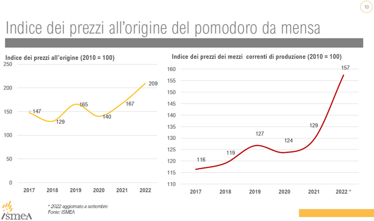 Analizzando l’indice dei prezzi all’origine del pomodoro da mensa, si può notare un andamento altalenante tra 2017 e 2020. Dal 2020 in poi è ben visibile l’aumento dei prezzi, che sembrano aver toccato un picco in questo ultimo anno. Lo stesso trend si riflette anche nell’indice dei prezzi dei mezzi correnti di produzione, in netta salita dal 2020 a settembre 2022. Ben diverse sono però le strutture dei costi tra produzione in serra e in pieno campo. Come ha sottolineato Del Bravo “nella produzione in pieno campo, i costi variabili sono stimati in circa 23.500 euro ad ettaro mentre per la produzione in serra si alzano a 42.500 euro ad ettaro. Questo perché in serra c’è una maggiore incidenza della spesa per prodotti energetici sul costo della manodopera rispetto alla coltivazione in pieno campo”. I dati Ismea sottolineano anche come a partire dal secondo semestre 2021, i prezzi dei mezzi correnti di produzione abbiano subito forti aumenti: i maggiori rincari si sono registrati per concimi, carburanti ed energia elettrica.