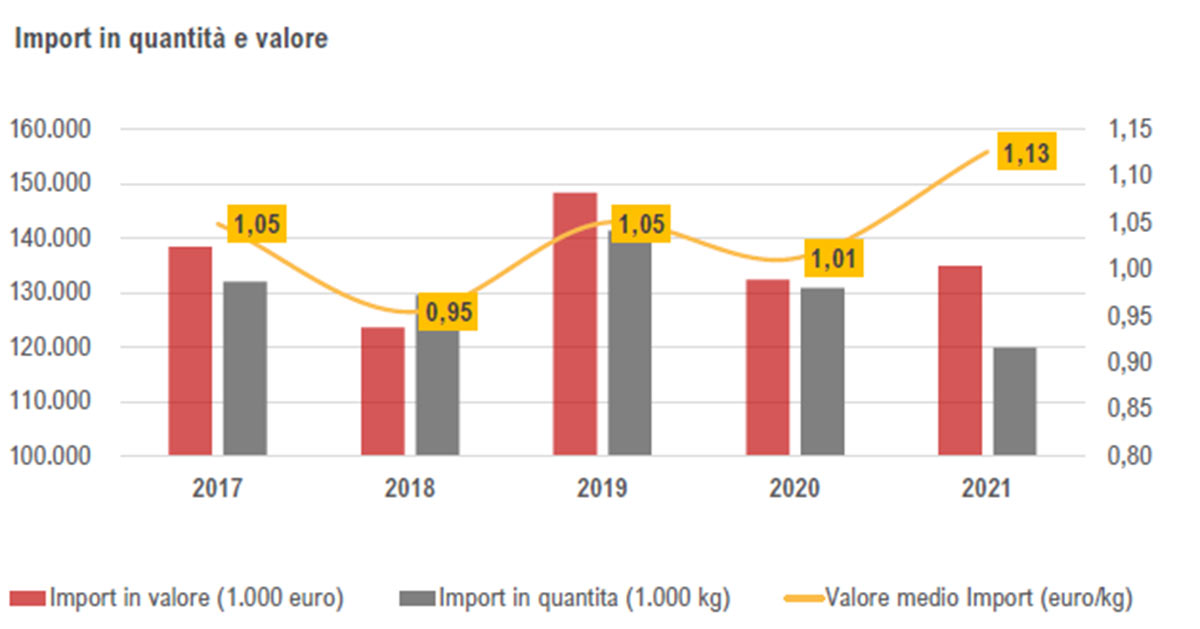 Analizzando le importazioni di pomodoro da mensa italiane, si può facilmente notare una discreta oscillazione negli anni, soprattutto a volume. Stando ai dati Ismea “tra il 2017 e il 2021 le importazioni di pomodoro da mensa italiane hanno oscillato tra 120 e 141 milioni di chilogrammi con una spesa che è cresciuta nel 2019 fino a 148 milioni di euro. Il prezzo medio annuo del prodotto importato è compreso tra 0,95 e 1,13 euro al chilogrammo, con il valore più alto per questo ultimo periodo”.