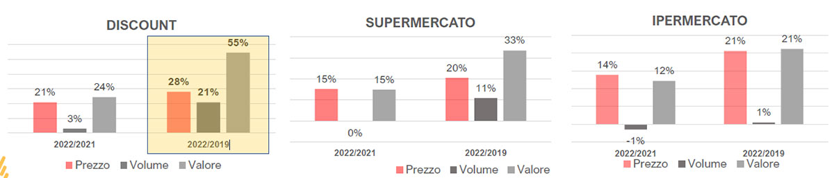 Una grande differenza si nota però tra le vendite del discount e quelle effettuate in supermercati, ipermercati ed e-commerce. “Il discount ha assottigliato nell’ultimo anno il differenziale di prezzo con gli altri canali – commenta Dal Bravo – se nel 2019 il differenziale del prezzo tra discount e supermercato era del 31%, oggi si è abbassata del 23%. La crescita è stata del 26% in 4 anni nel discount e del 18% nel super, del 17% negli iper. Come sempre le vendite online, nella loro quasi irrilevanza, evidenziano un forte orientamento alla gamma alta”.