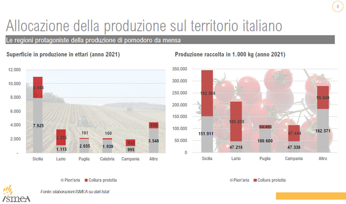 Le regioni protagoniste della produzione di pomodoro da mensa in termini di superfici sono Sicilia, Lazio e Puglia, seguite da Calabria, Campania e altre. A prevalere è sicuramente la produzione a pien’aria, con in testa la Sicilia (7925 ettari nel 2021), seguita da Puglia (2035 ettari), Calabria (1939 ettari) e Campania (935 ettari). In Lazio prevale invece la coltura protetta (pari a 2255 ettari nel 2021), che è invece più limitata in Sicilia (3043 ettari) e Campania (932 ettari) e quasi residuale in Calabria (160 ettari) e Puglia (101 ettari). La stessa graduatoria regionale si ottiene anche in termini di produzione raccolta in tonnellate: in testa la Sicilia con quasi 344 mila tonnellate prodotte, seguita dal Lazio con 213 mila tonnellate e Puglia con 115 mila tonnellate e Campania con quasi 115 mila tonnellate.