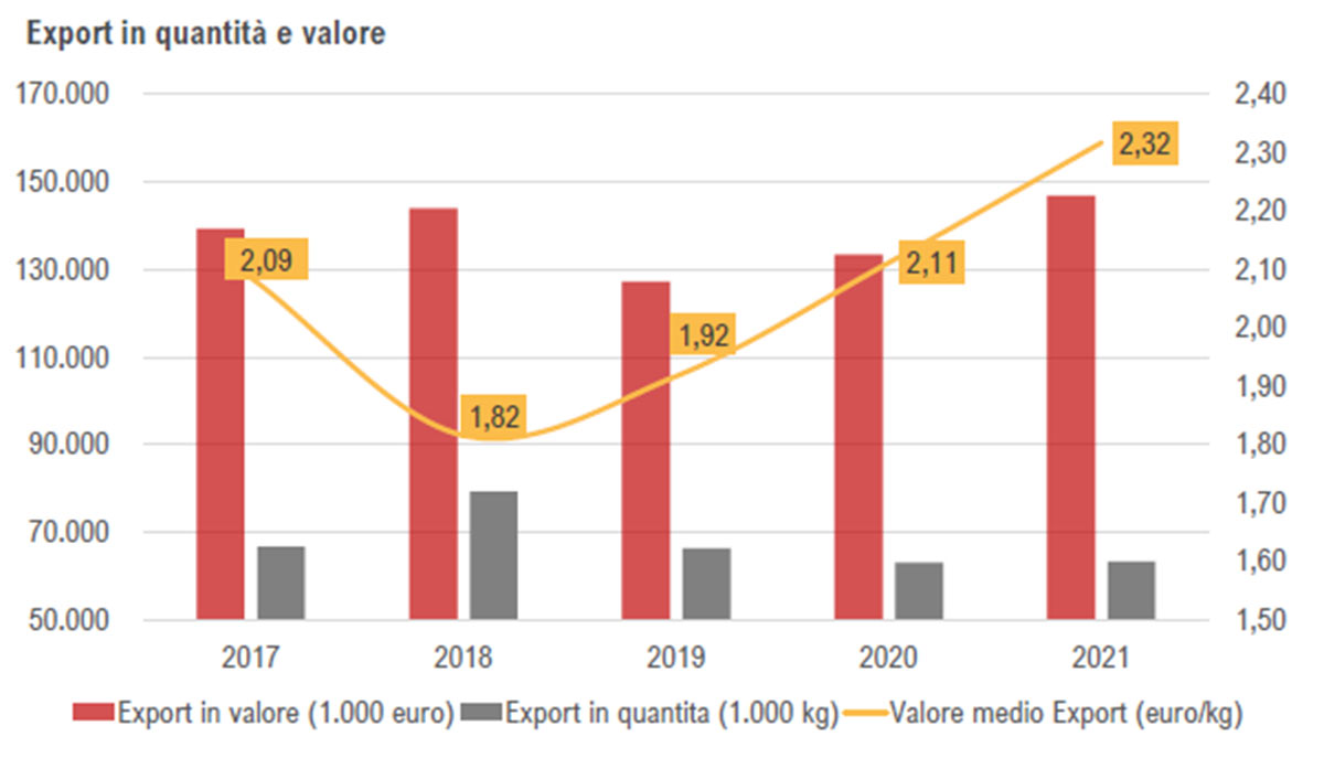 Se consideriamo invece l’export, si nota come “tra il 2017 e il 2021 le esportazioni di pomodoro da mensa italiano sono scese da 67 a 63 milioni di chilogrammi – riportano le elaborazioni Ismea sui dati Istat – mentre gli introiti sono diminuiti da 144 a 127 milioni di euro nel 2019, per poi risalire a 147 milioni di euro nel 2021. Il prezzo medio annuo è compreso tra 1,82 e 2,32 euro al chilogrammo, rispettivamente nel 2018 e nel 2021”.