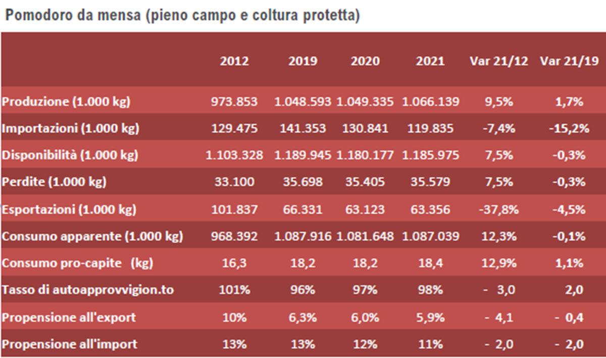 Venendo alla struttura produttiva, le elaborazioni Ismea sui dati Istat sottolineano come “la produzione italiana di pomodoro da mensa si aggiri intorno a un milione di tonnellate e come sia in lieve crescita, anche sul lungo periodo paria a +9,5% in dieci anni”. Il consumo apparente ammonta a circa un milione di tonnellate, che corrispondono ad un consumo pro capite annuo di circa 18 chilogrammi, anche questo in crescita nel lungo periodo (+12,9% nel decennio). “Le variazioni congiunturali sono influenzate principalmente dalle superfici investite, dalle condizioni meteo che condizionano la resa e dal mercato internazionale – specifica il responsabile Ismea – Va inoltre notato come sia in peggioramento l’approvvigionamento e di come l’Italia rimanga dipendente per una quota di circa il 10% di prodotto estero”.
