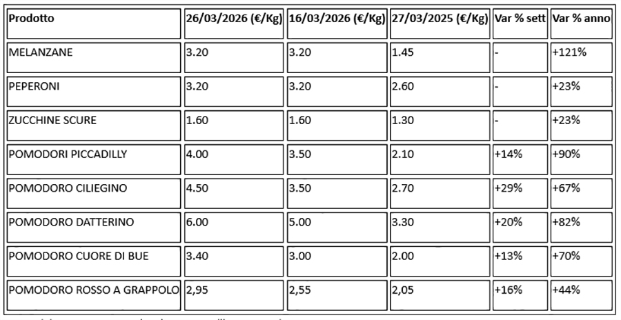 Rispetto alla scorsa settimana, per i prodotti siciliani come melanzane, peperoni e zucchine si registra stabilità, sebbene su livelli molto alti rispetto al 2025. In particolare, le melanzane registrano un incremento annuo vertiginoso del +121% arrivando a costare 3,20 euro/Kg a fronte di 1,45 euro/Kg del 2025 ma nessuna variazione rispetto alla scorsa settimana.