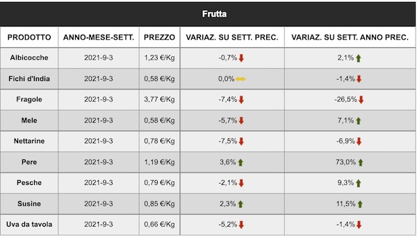 Anche per la frutta Ismea sottolinea che la terza settimana del mese non ha mostrato particolari variazioni rispetto al passato. Si conferma favorevole l'andamento delle vendite per le ultime quote di drupacee, complici le disponibilità sempre più contenute, mentre prosegue la raccolta per l'uva da tavola con quantitativi in incremento e prezzi in ulteriore flessione. Per le pomacee le attività risultano incentrate sulla raccolta e stoccaggio in magazzino del prodotto, con prezzi in campagna al rialzo per le pere, davvero poche.