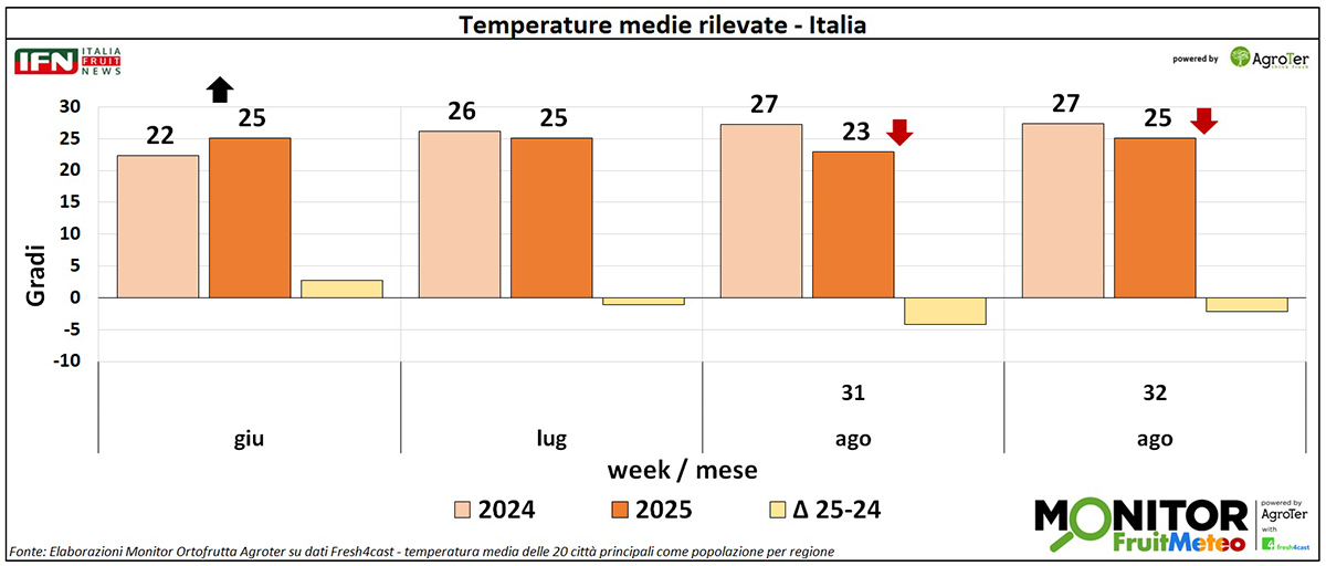 Una possibile spiegazione arriva anche dall'andamento climatico. Dopo un giugno più caldo e un luglio con temperature medie sostanzialmente in linea con il 2024, l’avvio di agosto ha segnato un brusco calo: -4 gradi nella week 31 e -2 gradi nella week 32. Per frutti estivi come angurie e meloni, questo spesso incide sui consumi e sulla controcifra rispetto all’anno precedente.