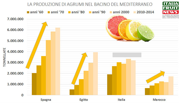 La produzione mondiale di agrumi aggiornata al 2014 è di circa 138 milioni di tonnellate. I principali produttori mondiali sono Cina (quasi 35 milioni di tonnellate), Brasile (19 milioni) e India (11 milioni), stando ai dati Faostat più aggiornati. L'Italia non rientra nella top ten, classificandosi come dodicesima.Focalizzandosi sui mercati del Mediterraneo, prima per produzione - e in continua crescita dagli anni Sessanta - è la Spagna (7 milioni di tonnellate), seguita da Egitto (4,4 milioni), anch'esso in crescita stabile dalle decadi precedenti, Italia e Marocco (1,7 milioni).