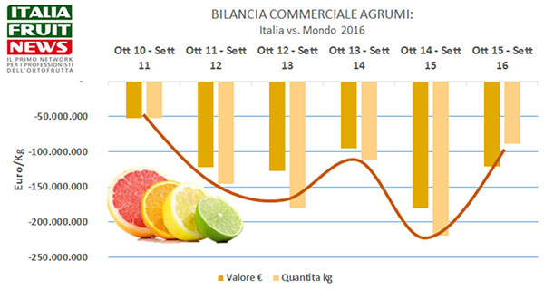 Un bilancio, e una bilancia commerciale, in negativo per l'Italia: anche per il 2015 si conferma un saldo in rosso tra export e import di agrumi. L'import italiano è infatti ancora dominante rispetto all'export, nonostante il notevole aumento delle movimentazioni in uscita rispetto all'anno precedente.