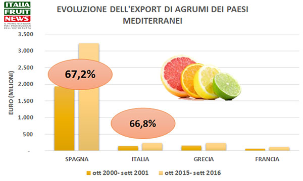 In Europa, a farla da padrone, sono le esportazioni della Spagna, che ha movimentato 3.2 miliardi di euro in agrumi nell'annata 2015-2016 (+67% rispetto al 2000-2001), seguita molto da lontano, dall'Italia (234 milioni di export), dalla Grecia (232 milioni) e dalla Francia (116 milioni).