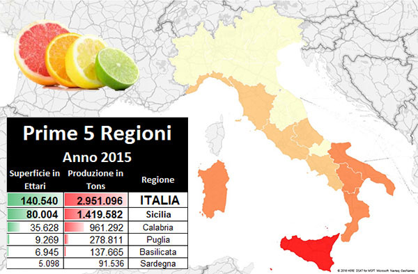 Secondo i dati Istat, la produzione italiana di agrumi nel 2015 è stata di 2,9 milioni di tonnellate, avendo come polo prevalente di produzione la Sicilia e la Calabria, che rappresentano l'80% della produzione totale nel nostro Paese. Medesimo discorso per le superfici coltivate: le prime tre regioni produttrici corrispondono al 82% del totale delle superfici coltivate, che sono 140 mila ettari. Interessante il dato relativo alle superfici coltivate a biologico che, secondo il Sinab, ammontano a quasi 32 mila ettari (considerando sia quelle a regime che quelle in conversione), cioè il 23% del totale.La Sicilia si conferma al primo posto tra le regioni italiane, con 80 mila ettari coltivati e una produzione di circa 1.4 milioni di tonnellate di agrumi, seguita dalla Calabria con 961mila tonnellate, la Puglia con 278mila, la Basilicata con 137mila ed infine la Sardegna con 91mila.