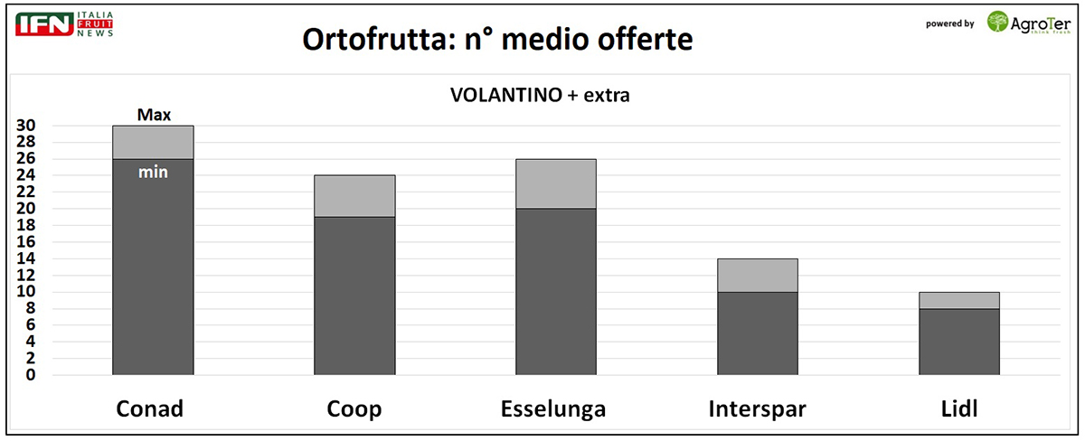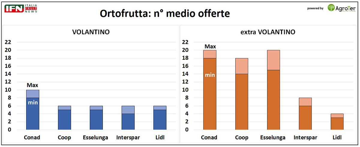 Le promozioni nel reparto ortofrutta restano numerose, sebbene si siano evolute negli strumenti di comunicazione e nei rapporti tra offerte non pubblicizzate (in crescita) e quelle a volantino (in calo). Queste ultime, infatti, tendono a essere più rarefatte a causa di incertezze legate alla disponibilità dei prodotti.