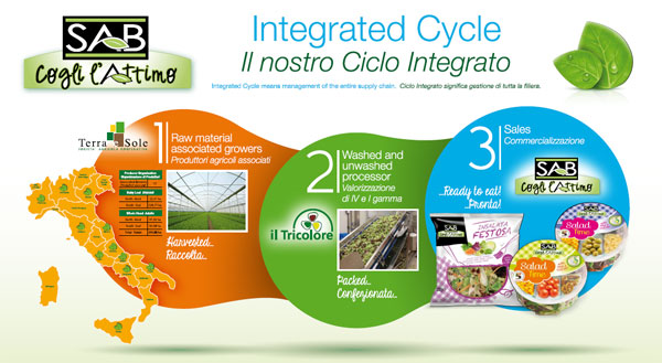 Il ciclo integrato di SAB significa gestione di tutta la filiera, non un semplice controllo delle varie fasi che, dal seme alla tavola, garantisce al consumatore un prodotto assolutamente rintracciabile. I nostri agricoltori associati nella cooperativa "Terra e Sole" conferiscono in esclusiva la propria materia prima al Consorzio OP "Il Tricolore" che si occupa di valorizzarlo attraverso varie fasi per poi consegnarlo presso le piattaforme dei clienti per conto della commerciale SAB Ortofrutta.