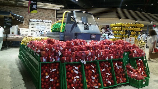 Subito a ridosso dell'entrata, nel punto più «caldo» del reparto in termini di afflusso di clienti, appare un'area espositiva di altissima attrazione: una composizione di prodotti stagionali a cerchio ed un elemento «decorativo» strettamente legato all'ortofrutta, ma abbastanza insolito all'interno di un supermercato, ovvero un'apecar.