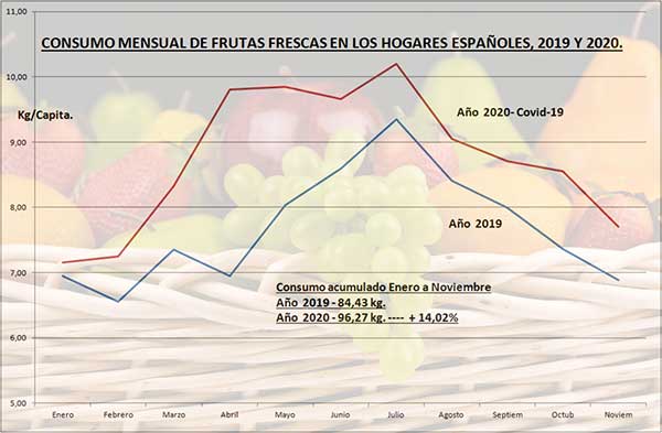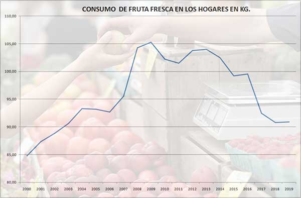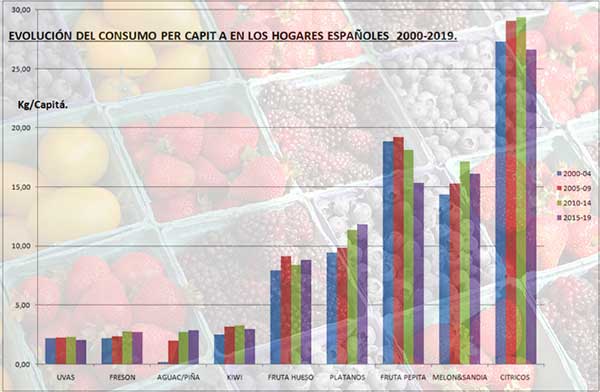 I dati più attendibili sul consumo di frutta in Spagna sono disponibili nell'annuario del Ministero dell'Agricoltura spagnolo. Dall'analisi dei dati si deduce che questo consumo equivale al 99% del consumo di frutta fresca in Spagna, poiché il consumo fuori casa è di circa l'1%. Possiamo quindi affermare con sufficiente sicurezza che, a prescindere dai possibili errori che un qualsiasi calcolo statistico comporta, i trend riportati dai dati del Ministero sono molto vicini alla realtà.