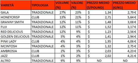 Esaminando le varietà vendute dai retailer statunitensi (fonte Nielsen), a dicembre 2016 emerge un capovolgimento delle quote rispetto all'Italia. Come si può notare dalla tabella, la mela più venduta è la Gala, che rappresenta il 27% dei volumi scambiati, seguita da Honeycrisp, Granny Smith, Fuji e Red Delicious, con valori, simili tra loro, di poco superiori al 10%. La Golden Delicious, che in Italia vale mediamente il 50% del mercato, negli States non supera il 5%, seguita da Pink lady, McIntosh (la mela di Steve Jobs), Ambrosia e Jazz.
