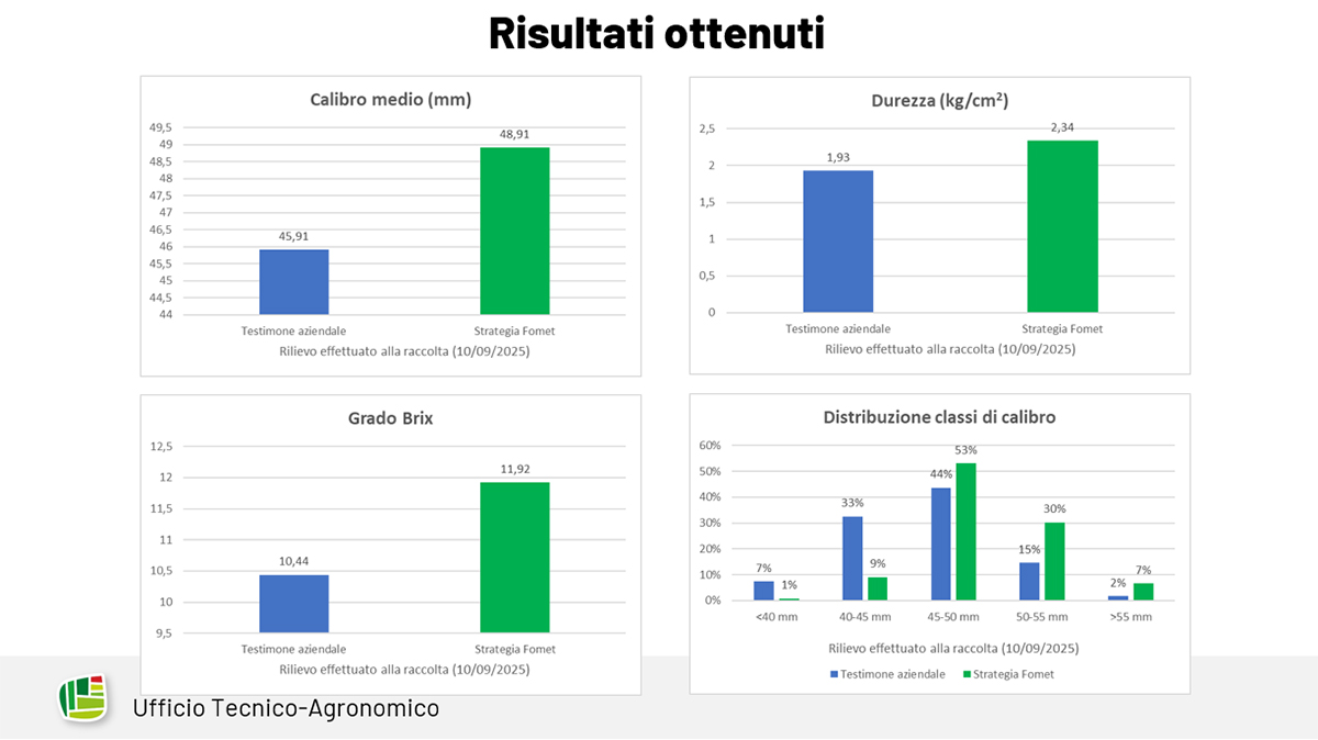Il calibro medio dei frutti nelle parcelle trattate con la strategia Fomet ha raggiunto i 49,15 mm, contro i 45,94 mm del testimone aziendale. Un incremento di oltre 3 millimetri, pari a più del 7% con una una maggiore incidenza delle classi di pezzatura più richieste dal mercato.