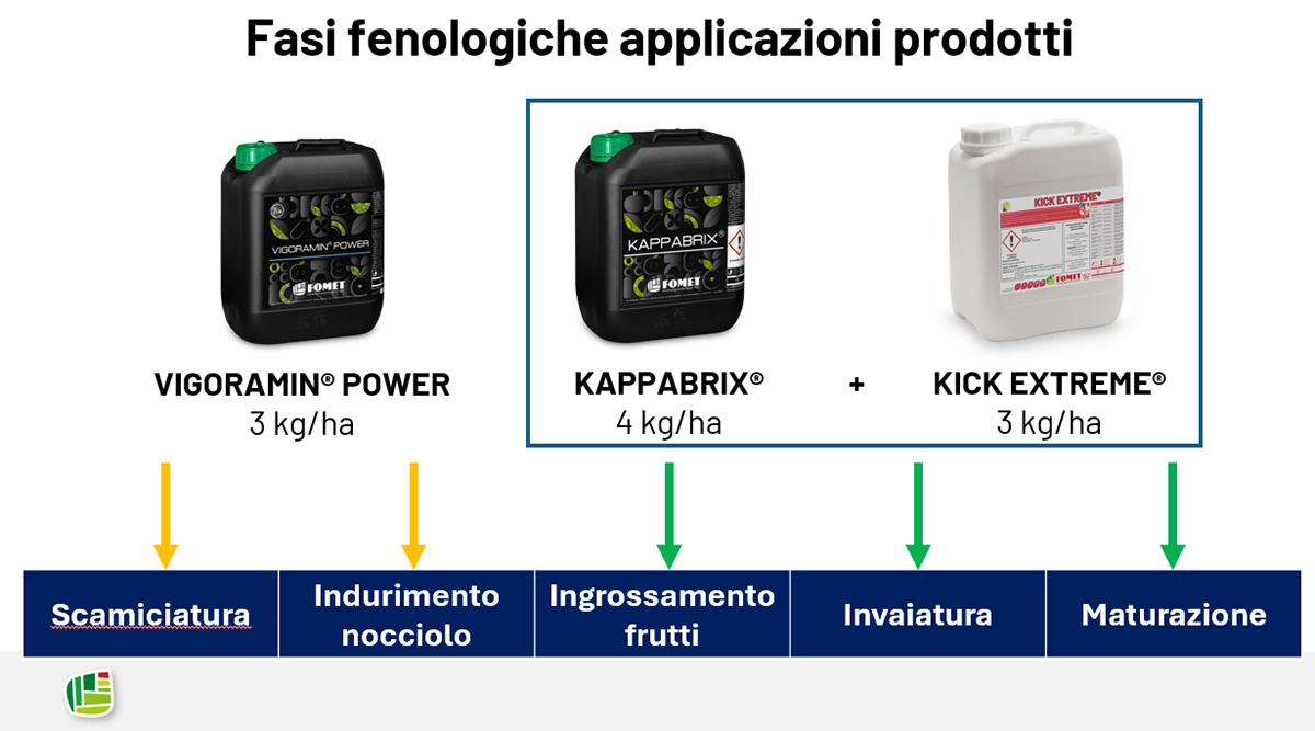 L’attività è stata realizzata nel corso della campagna 2025, su un impianto del 2020 allevato ad asse verticale, con una densità di oltre 1.600 piante per ettaro. Il confronto ha messo a paragone la strategia aziendale standard con un protocollo Fomet basato su applicazioni fogliari in momenti chiave dello sviluppo del frutto.