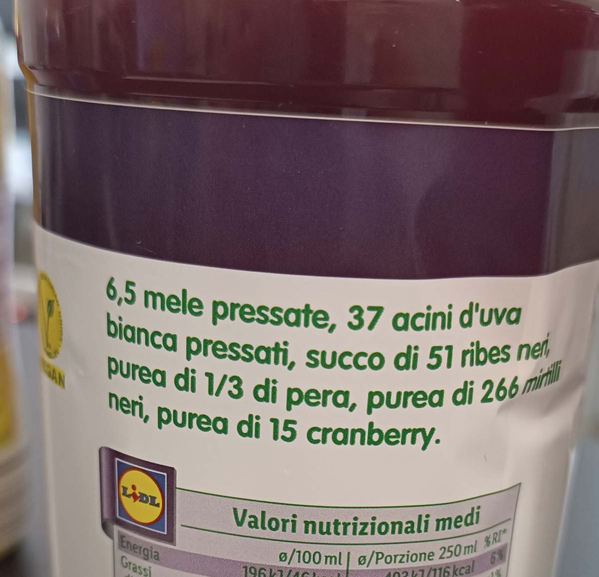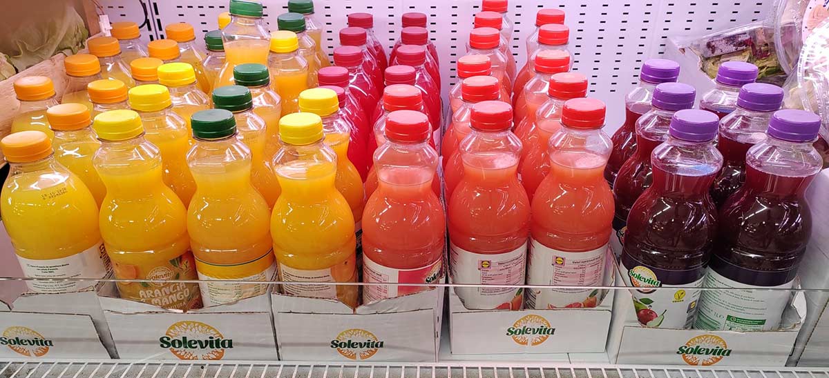 Infatti, durante una delle ultime rilevazioni presso alcuni punti vendita Lidl, ci siamo imbattuti nella linea di succhi freschi realizzati solo con frutta e purea a marchio Solevita, di proprietà di Lidl, in formato da 1 litro che affiancano quelli da 250 ml.