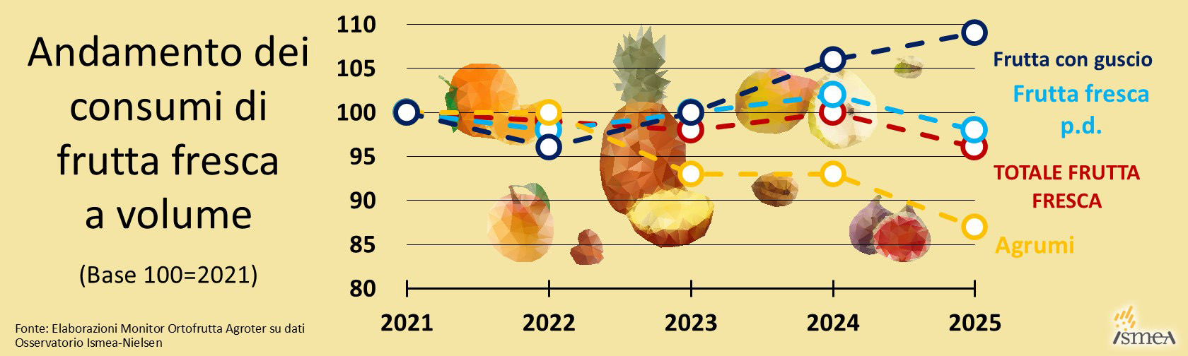 Sul fronte della frutta fresca a volume il quadro resta debole. Nel 2025, rispetto al 2021, il totale frutta a volume lascia sul terreno il 4%, la frutta fresca a propriamente detta arretra del 2% e gli agrumi cedono addirittura il 13%. A salvarsi è la frutta con guscio, che invece cresce del 9%. Il punto messo in evidenza da Alfonso Bendi, responsabile scientifico di Agroter Group, è che la frutta, nel suo insieme, non ha ancora recuperato i livelli di quattro anni fa. E l’avvio del 2026, nei primi mesi dell’anno, non cambia la sostanza del problema. “Siamo ancora sotto”, è il messaggio, tanto semplice quanto pesante.