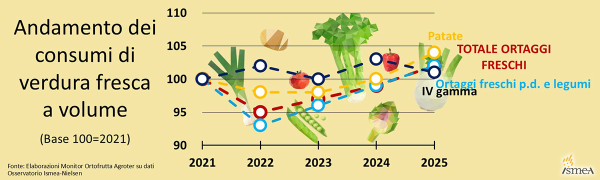 Va un po’ meglio sul versante della verdura, ma anche qui il quadro è meno lineare di quanto si potrebbe pensare. Nel confronto fra il 2025 con il 2021, gli ortaggi freschi crescono a volume del 2%, così come ortaggi propriamente detti e legumi. Le patate continuano a correre e salgono del 4%, confermandosi fra i fenomeni più dinamici del reparto, come evidenzia anche la crescita del 4,7% anche nel primo trimestre 2026. Ma la IV gamma, che sulla carta dovrebbe essere una delle categorie più allineate ai nuovi bisogni di consumo, resta praticamente ferma: appena +0,7% dal 2021 al 2025 e nel primo trimestre 2026 segna addirittura -0,7%. È una delle contraddizioni più evidenti emerse a Think Fresh. Perché il consumatore dice di volere praticità, semplicità, soluzioni d’uso, e poi proprio il segmento che più dovrebbe intercettare questa domanda continua a dare segnali deboli. “Un paradosso”, in sostanza, che impone una riflessione vera al comparto.