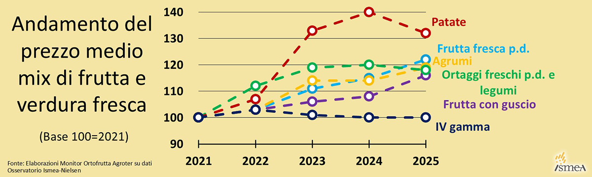 La lettura si fa ancora più interessante quando il confronto si sposta dai volumi ai prezzi. Perché in questi anni quasi tutte le grandi famiglie dell’ortofrutta hanno visto crescere il prezzo medio, espresso come euro/chilo, in misura rilevante. La frutta fresca propriamente detta sale del 22% rispetto al 2021, gli agrumi del 19%, la frutta con guscio del 16%, gli ortaggi freschi propriamente detti e i legumi del 18%. Le patate fanno molto di più: +32%, dopo aver toccato nel 2024 un picco del 40%. Eppure, dentro questo scenario di rivalutazione diffusa, c’è ancora una volta una categoria che stona: la IV gamma, i cui prezzi restano sostanzialmente fermi sui livelli del 2021. Qui sta uno dei passaggi più forti della giornata. Perché se tutto aumenta e una categoria di servizio non riesce a portare a casa valore, allora il problema non è il contesto generale: è il posizionamento, o meglio ancora la capacità di farsi percepire per quello che vale.