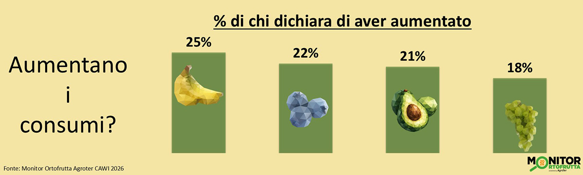 Lo stesso schema riappare, in modo ancora più chiaro, nei prodotti che oggi stanno crescendo. A trainare sono categorie che si portano dietro un beneficio semplice da decodificare. Le banane guidano con il 25% di consumatori che dichiarano di averne aumentato i consumi, seguite da mirtilli al 22%, avocado al 21% e uva senza semi al 18%. Non è solo una questione di moda. È, piuttosto, la conseguenza di una proposta che si incastra bene con i nuovi stili di vita: più pratica, più salutistica, più coerente con una dieta varia e funzionale. Nel caso delle banane, poi, il dato assume un peso ancora maggiore, perché riguarda il prodotto con il ruolo più centrale nei consumi di frutta in Italia.