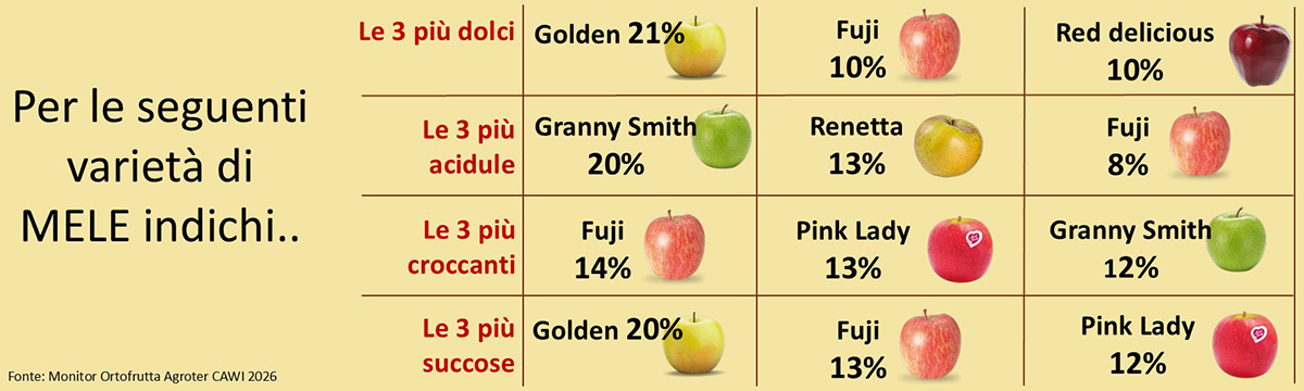 Il focus sulle mele è stato, da questo punto di vista, particolarmente eloquente. Alla domanda su quali siano le varietà top per dolcezza, croccantezza, succosità e acidità, continuano a dominare le cultivar classiche. Golden è riconosciuta come la più dolce dal 21% degli intervistati, Granny Smith come la più acidula dal 20%, mentre Fuji emerge sia per la succosità con il 14% sia per la croccantezza con il 13%. Pink Lady è l’unica varietà club che entra stabilmente nelle posizioni di vertice, ma nel complesso il quadro dice una cosa precisa: la memoria del consumatore continua a premiare le varietà più conosciute. “Le classiche la fanno ancora da padrone”, è in sostanza la sintesi.